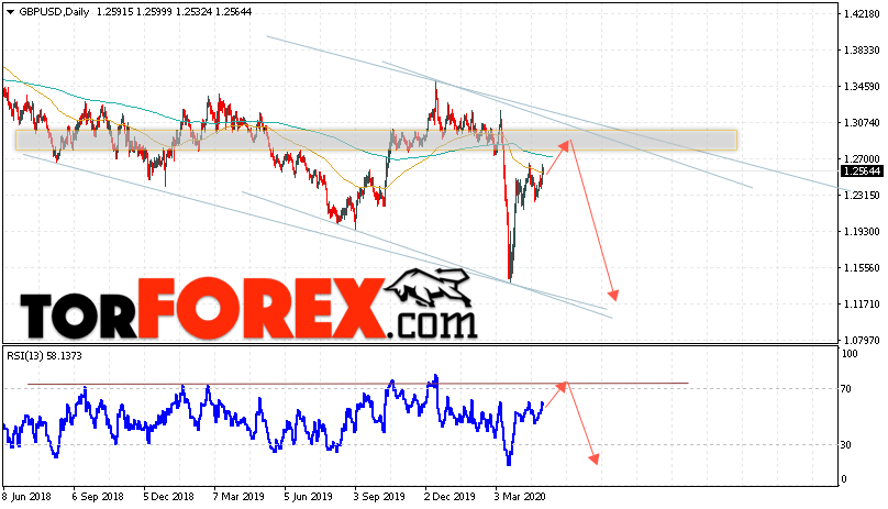 Дополнительным сигналом в пользу падения Британского Фунта выступит тест линии тренда на индикаторе относительной силы. Вторым сигналом станет отскок от верхней границы нисходящего канала. Отменой варианта падения пары GBP/USD на текущей торговой неделе 4 — 8 мая 2020 станет сильный рост и пробой области 1.3155. Это укажет на пробой области сопротивления и продолжение роста в область выше уровня 1.3465. Подтверждением падения валютной GBP/USD выступит пробой области поддержки и закрытие цен ниже уровня 1.2255.