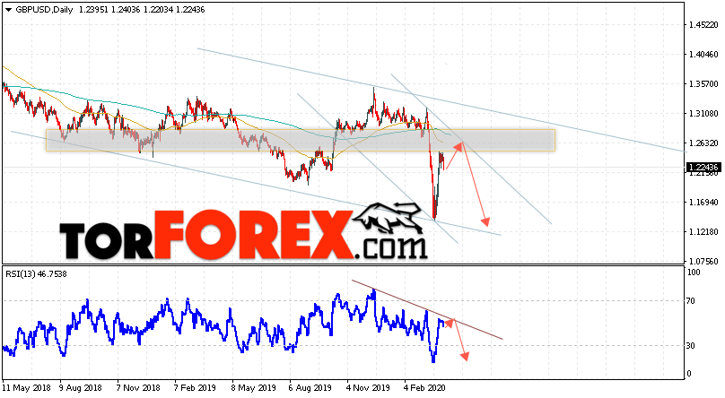 Таким образом, GBP/USD прогноз Форекс на неделю 6 — 10 апреля 2020 предполагает попытку теста уровня сопротивления вблизи области 1.2635. Откуда стоит ожидать продолжения падения пары с целью ниже области 1.1225. Дополнительным сигналом в пользу падения выступит тест линии тренда на индикаторе относительной силы. Отменой варианта снижения пары Фунт Доллар станет сильный рост и пробой уровня 1.3005. В этом случае стоит ожидать продолжения роста пары с потенциальной целью выше уровня 1.3505.