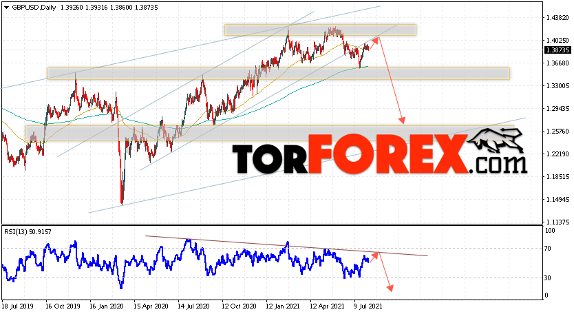 Таким образом, GBP/USD прогноз Форекс на неделю 9 — 13 августа 2021 предполагает попытку роста и теста уровня сопротивления вблизи области 1.4025. Откуда стоит ожидать продолжения падения валютной пары с целью ниже области 1.2655. Дополнительным сигналом в пользу снижения выступит тест линии тренда на индикаторе относительной силы. Отменой варианта падения пары Фунт Доллар станет сильный рост и пробой уровня 1.4485. В этом случае стоит ожидать продолжения подъёма пары с потенциальной целью выше уровня 1.5075.