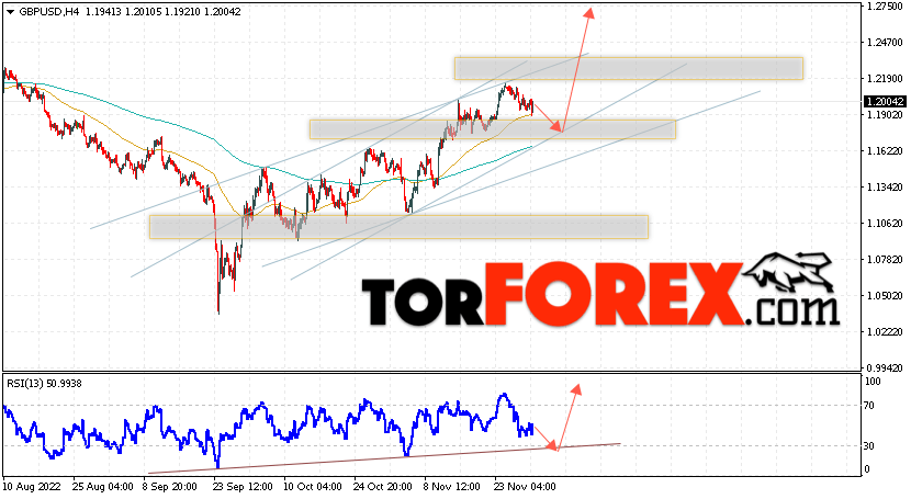 Валютная пара Фунт Доллар GBP/USD продолжает движение в рамках развития коррекции и бычьего канала. В момент публикации прогноза курс Фунта к Доллару США на Форекс составляет 1.2004. Скользящие средние указывают на наличие краткосрочной бычьей тенденции. Цены пробили область между сигнальными линиями вверх, что указывает на давление со стороны покупателей валютной пары и потенциальное продолжение роста инструмента. На данный момент стоит ожидать попытку развития коррекции цены курса Британского Фунта против Американского Доллара и тест области поддержки вблизи уровня 1.1655. Откуда вновь стоит ожидать отскок вверх и продолжения роста котировок валютной пары Британского Фунта против Доллара США. Целью подъёма пары, в рамках Форекс прогноза на 1 декабря 2022, выступает область на уровне 1.2755.