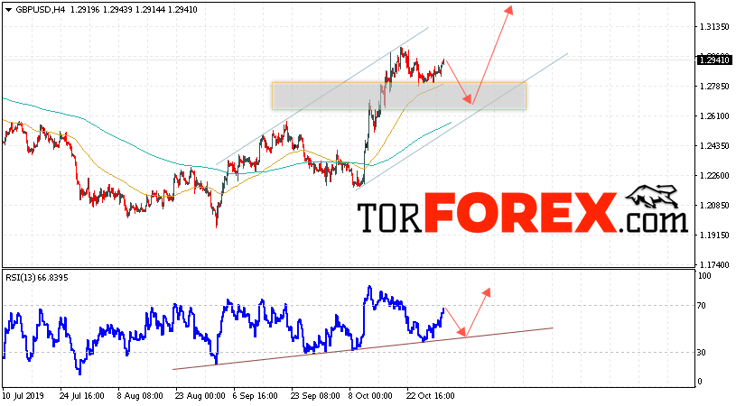 Валютная пара Фунт Доллар GBP/USD продолжает движение в рамках роста и восходящего канала. В момент публикации прогноза курс Фунта к Доллару США на Форекс составляет 1.2941. Скользящие средние указывают на наличие краткосрочной бычьей тенденции. На данный момент стоит ожидать попытку снижения курса Британского Фунта и тест области поддержки вблизи уровня 1.2635. Откуда вновь стоит ожидать отскок и продолжения подъёма котировок валютной пары Британского Фунта против Доллара США. Целью восходящего движения валютной пары, в рамках Форекс прогноза на 1 ноября 2019 года, выступает область на уровне 1.3175.