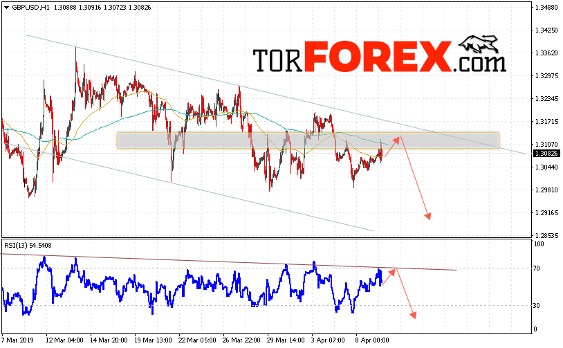Валютная пара Фунт Доллар GBP/USD продолжает движение в рамках нисходящего канала. В момент публикации прогноза курс Фунта к Доллару США составляет 1.3082. На данный момент стоит ожидать попытку роста и тест области сопротивления вблизи уровня 1.3115. Откуда вновь стоит ожидать отскок и продолжение падения Фунта против Доллара. Целью нисходящего движения валютной пары, в рамках Форекс прогноза на 10 апреля 2019 года, выступает область на уровне 1.2915.