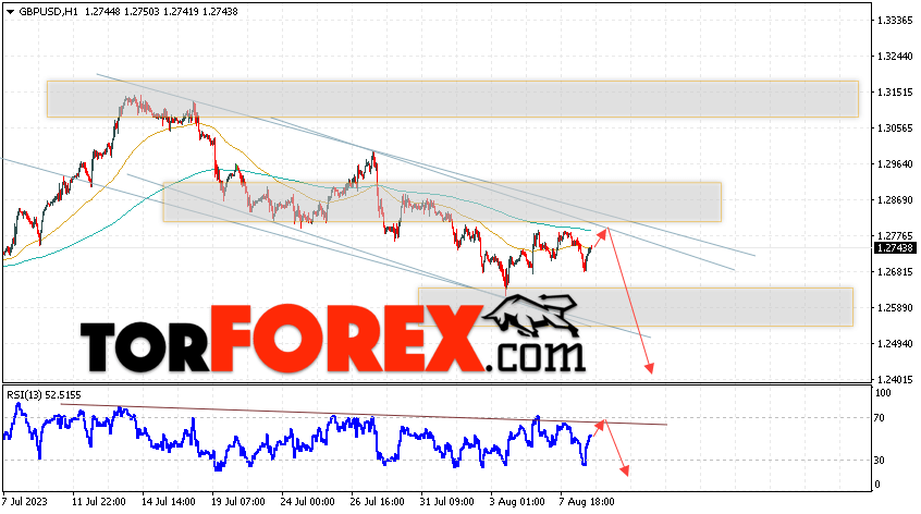 Валютная пара Фунт Доллар GBP/USD продолжает движение в рамках развития падения и медвежьего канала. В момент публикации прогноза курс Фунта к Доллару США на Форекс составляет 1.2743. Скользящие средние указывают на наличие краткосрочной медвежьей тенденции. Цены пробили область между сигнальными линиями вниз, что указывает на давление со стороны продавцов валютной пары и потенциальное продолжение падения инструмента. На данный момент стоит ожидать попытку развития бычьей коррекции курса Британского Фунта против Американского Доллара и тест области сопротивления вблизи уровня 1.2775. Откуда вновь стоит ожидать отскок котировок пары вниз и продолжения падения валютной пары Британского Фунта против Доллара США. Целью снижения пары, в рамках Форекс прогноза на 10 августа 2023, выступает область на уровне 1.2425.