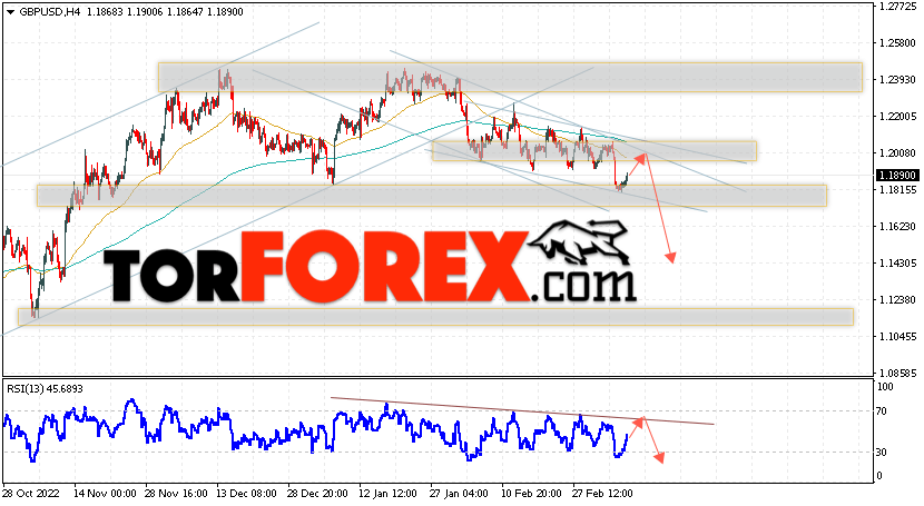 Валютная пара Фунт Доллар GBP/USD продолжает движение в рамках коррекции после сильного падения и нисходящего канала. В момент публикации прогноза курс Фунта к Доллару США на Форекс составляет 1.1890. Скользящие средние указывают на наличие краткосрочной бычьей тенденции. Цены вновь тестируют область между сигнальными линиями, что указывает на давление со стороны продавцов валютной пары и потенциальное продолжение падения инструмента. На данный момент стоит ожидать попытку развития роста курса Британского Фунта против Американского Доллара и тест области сопротивления вблизи уровня 1.2005. Откуда вновь стоит ожидать отскок вниз и продолжения падения котировок валютной пары Британского Фунта против Доллара США. Целью снижения пары, в рамках Форекс прогноза на 10 марта 2023, выступает область на уровне 1.1445.