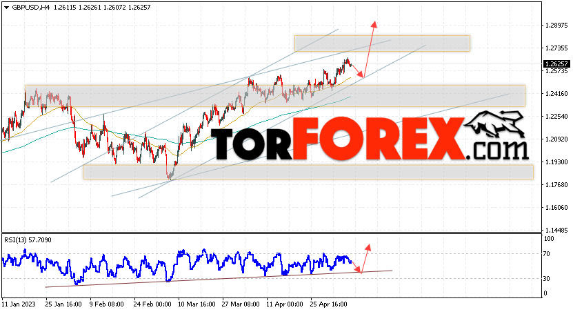Валютная пара Фунт Доллар GBP/USD продолжает движение в рамках развития роста и бычьего канала. В момент публикации прогноза курс Фунта к Доллару США на Форекс составляет 1.2625. Скользящие средние указывают на наличие краткосрочной бычьей тенденции. Цены пробили область между сигнальными линиями вверх, что указывает на давление со стороны покупателей валютной пары и потенциальное продолжение роста инструмента. На данный момент стоит ожидать попытку развития снижения курса Британского Фунта против Американского Доллара и тест области поддержки вблизи уровня 1.2560. Откуда вновь стоит ожидать отскок вверх и продолжения роста котировок валютной пары Британского Фунта против Доллара США. Целью подъёма пары, в рамках Форекс прогноза на 10 мая 2023, выступает область на уровне 1.2895.