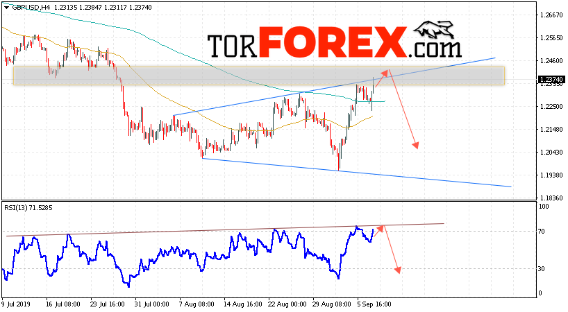 Валютная пара Фунт Доллар GBP/USD продолжает движение в рамках роста и формирования модели «Расширяющийся Треугольник». В момент публикации прогноза курс Фунта к Доллару США на Форекс составляет 1.2374. Скользящие средние указывают на наличие краткосрочной медвежьей тенденции. На данный момент стоит ожидать попытку роста курса Британского Фунта и тест области сопротивления вблизи уровня 1.2385. Откуда вновь стоит ожидать отскок и продолжение снижения котировок валютной пары Британского Фунта против Доллара США. Целью нисходящего движения валютной пары, в рамках Форекс прогноза на 10 сентября 2019 года, выступает область на уровне 1.2045.