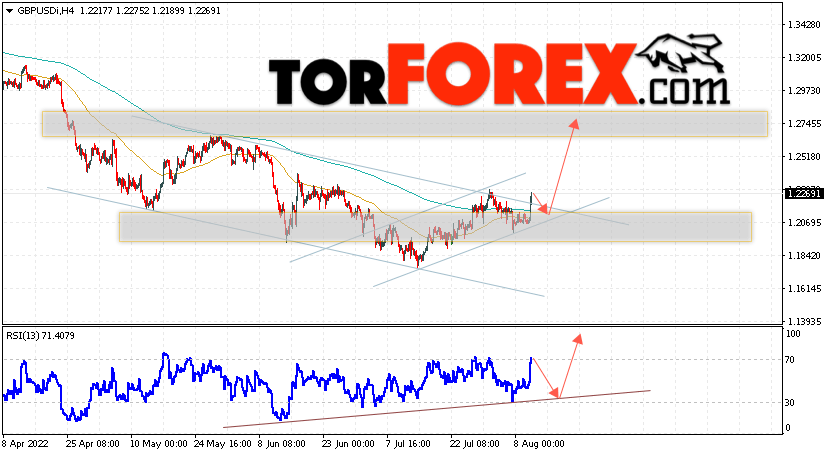 Валютная пара Фунт Доллар GBP/USD продолжает движение в рамках роста и покинула пределы нисходящего канала. В момент публикации прогноза курс Фунта к Доллару США на Форекс составляет 1.2269. Скользящие средние указывают на наличие краткосрочной медвежьей тенденции. Цены пробили область между сигнальными линиями вверх, что указывает на давление со стороны покупателей валютной пары и потенциальное продолжение роста инструмента. На данный момент стоит ожидать попытку развития падения цены курса Британского Фунта против Американского Доллара и тест области поддержки вблизи уровня 1.2085. Откуда вновь стоит ожидать отскок вверх и продолжения роста котировок валютной пары Британского Фунта против Доллара США. Целью подъёма пары, в рамках Форекс прогноза на 11 августа 2022, выступает область на уровне 1.2765.