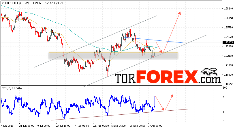 Валютная пара Фунт Доллар GBP/USD продолжает движение в рамках сильного роста и восходящего канала. В момент публикации прогноза курс Фунта к Доллару США на Форекс составляет 1.2387. Скользящие средние указывают на наличие краткосрочной нисходящей тенденции, однако быки смогли вытолкнуть цены выше уровня сигнальных линий. На данный момент стоит ожидать попытку снижения курса Британского Фунта и тест области поддержки вблизи уровня 1.2225. Откуда вновь стоит ожидать отскок и продолжения подъёма котировок валютной пары Британского Фунта против Доллара США. Целью восходящего движения валютной пары, в рамках Форекс прогноза на 11 октября 2019 года, выступает область на уровне 1.2695.