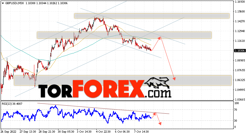 Валютная пара Фунт Доллар GBP/USD продолжает движение в рамках развития падения и нисходящего канала. В момент публикации прогноза курс Фунта к Доллару США на Форекс составляет 1.1030. Скользящие средние указывают на наличие краткосрочной медвежьей тенденции. Цены пробили область между сигнальными линиями вниз, что указывает на давление со стороны продавцов валютной пары и потенциальное продолжение падения инструмента. На данный момент стоит ожидать попытку развития бычьей коррекции цены курса Британского Фунта против Американского Доллара и тест области сопротивления вблизи уровня 1.1165. Откуда вновь стоит ожидать отскок вниз и продолжения падения котировок валютной пары Британского Фунта против Доллара США. Целью снижения пары, в рамках Форекс прогноза на 11 октября 2022, выступает область на уровне 1.0635.
