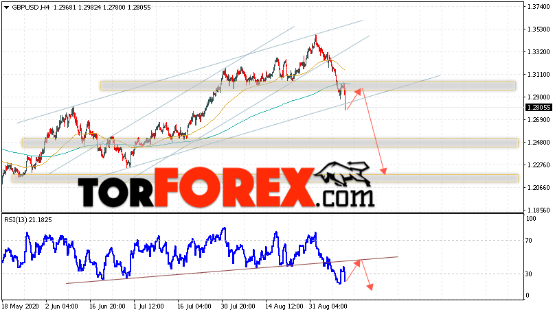 Валютная пара Фунт Доллар GBP/USD продолжает движение в рамках падения и начала отработки разворотной модели ”Волны Вульфа”. В момент публикации прогноза курс Фунта к Доллару США на Форекс составляет 1.2805. Скользящие средние указывают на наличие краткосрочной бычьей тенденции. Цены пробили область между сигнальными линиями вниз, что указывает на давление со стороны продавцов валютной пары и потенциальное продолжение падения актива. На данный момент стоит ожидать попытку коррекции курса Британского Фунта против Американского Доллара и тест области сопротивления вблизи уровня 1.2945. Откуда вновь стоит ожидать отскок и начало падения котировок валютной пары Британского Фунта против Доллара США. Целью нисходящего движения валютной пары, в рамках Форекс прогноза на 11 сентября 2020, выступает область на уровне 1.2255.
