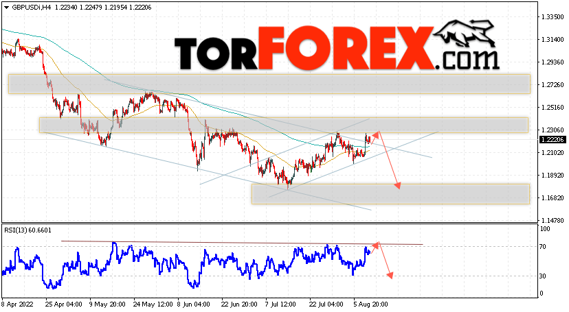 Валютная пара Фунт Доллар GBP/USD продолжает движение в рамках коррекции и нисходящего канала. В момент публикации прогноза курс Фунта к Доллару США на Форекс составляет 1.2220. Скользящие средние указывают на наличие краткосрочной медвежьей тенденции. Цены пробили область между сигнальными линиями вверх, что указывает на давление со стороны покупателей валютной пары и потенциальное продолжение роста инструмента. На данный момент стоит ожидать попытку развития коррекции цены курса Британского Фунта против Американского Доллара и тест области сопротивления вблизи уровня 1.2245. Откуда вновь стоит ожидать отскок вниз и продолжения падения котировок валютной пары Британского Фунта против Доллара США. Целью снижения пары, в рамках Форекс прогноза на 12 августа 2022, выступает область на уровне 1.1725.