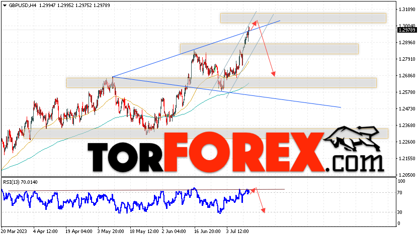 Валютная пара Фунт Доллар GBP/USD продолжает движение в рамках развития сильного роста и формирования медвежьей модели «Волна Вульфа». В момент публикации прогноза курс Фунта к Доллару США на Форекс составляет 1.2978. Скользящие средние указывают на наличие краткосрочной бычьей тенденции. Цены пробили вверх область между сигнальными линиями, что указывает на давление со стороны покупателей валютной пары и потенциальное продолжение роста инструмента. На данный момент стоит ожидать попытку развития подъёма курса Британского Фунта против Американского Доллара и тест области сопротивления вблизи уровня 1.3025. Откуда вновь стоит ожидать отскок котировок пары вниз и продолжения падения валютной пары Британского Фунта против Доллара США. Целью снижения пары, в рамках Форекс прогноза на 13 июля 2023, выступает область на уровне 1.2665.