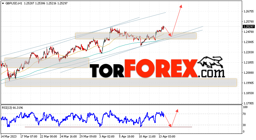 Валютная пара Фунт Доллар GBP/USD продолжает движение в рамках развития роста и бычьего канала. В момент публикации прогноза курс Фунта к Доллару США на Форекс составляет 1.2529. Скользящие средние указывают на наличие краткосрочной бычьей тенденции. Цены пробили область между сигнальными линиями вверх, что указывает на давление со стороны покупателей валютной пары и потенциальное продолжение роста инструмента. На данный момент стоит ожидать попытку развития коррекции курса Британского Фунта против Американского Доллара и тест области поддержки вблизи уровня 1.2465. Откуда вновь стоит ожидать отскок вверх и продолжения роста котировок валютной пары Британского Фунта против Доллара США. Целью подъёма пары, в рамках Форекс прогноза на 14 апреля 2023, выступает область на уровне 1.2725.