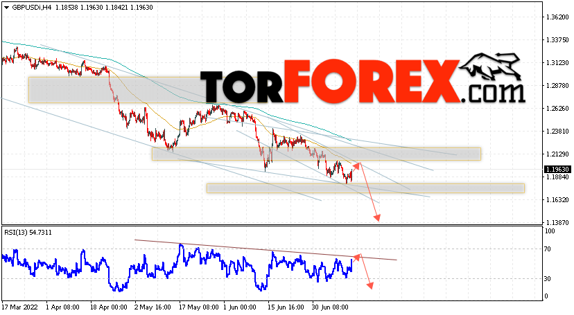 Валютная пара Фунт Доллар GBP/USD продолжает движение в рамках коррекции и нисходящего канала. В момент публикации прогноза курс Фунта к Доллару США на Форекс составляет 1.1961. Скользящие средние указывают на наличие краткосрочной медвежьей тенденции. Цены пробили область между сигнальными линиями вниз, что указывает на давление со стороны продавцов валютной пары и потенциальное продолжение падения инструмента. На данный момент стоит ожидать попытку развития подъёма цены курса Британского Фунта против Американского Доллара и тест области сопротивления вблизи уровня 1.1995. Откуда вновь стоит ожидать отскок вниз и продолжения падения котировок валютной пары Британского Фунта против Доллара США. Целью снижения пары, в рамках Форекс прогноза на 14 июля 2022, выступает область на уровне 1.1345.