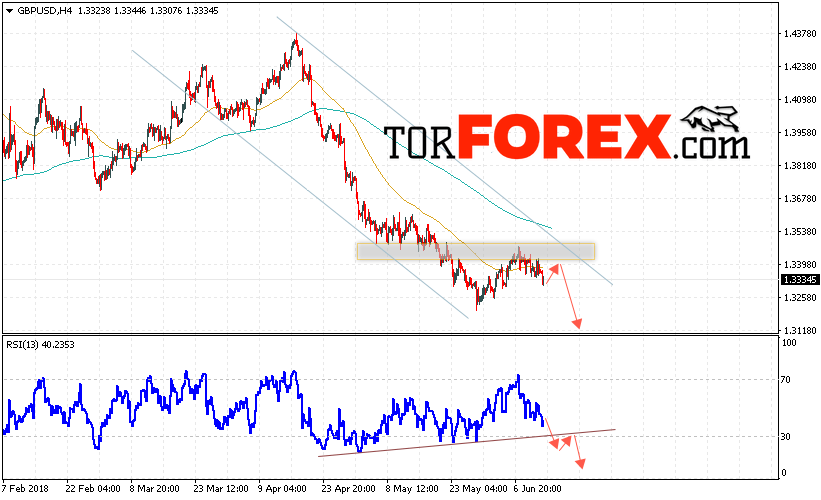 Таким образом, GBP/USD прогноз Фунт Доллар на 14 июня 2018 предполагает попытку теста области сопротивления вблизи уровня 1.3400 и продолжение падения с целью ниже уровня 1.3120, дополнительным сигналом в пользу падения Британского Фунта выступит пробой линии поддержки на индикаторе относительной силы, отменой варианта падения станет сильный рост и пробой области 1.3450.