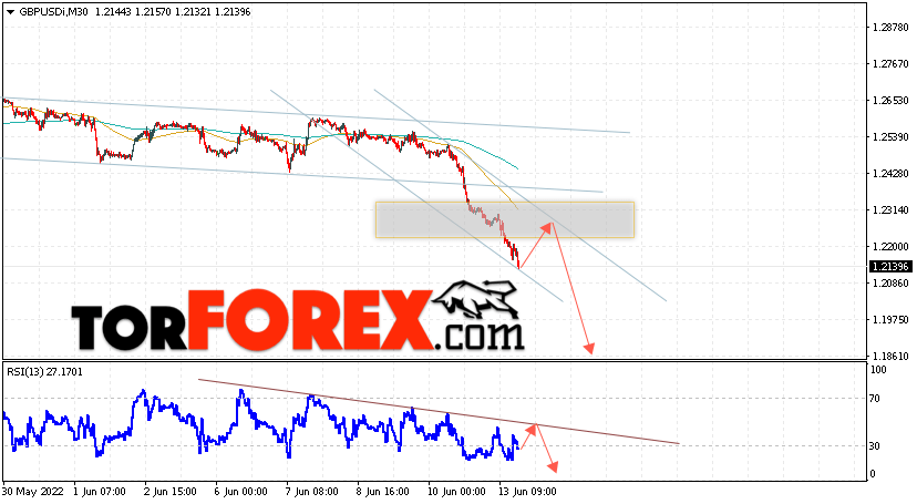 Валютная пара Фунт Доллар GBP/USD продолжает движение в рамках падения и нисходящего канала. В момент публикации прогноза курс Фунта к Доллару США на Форекс составляет 1.2139. Скользящие средние указывают на наличие краткосрочной медвежьей тенденции. Цены пробили область между сигнальными линиями вниз, что указывает на давление со стороны продавцов валютной пары и потенциальное продолжение падения инструмента. На данный момент стоит ожидать попытку развития подъёма цены курса Британского Фунта против Американского Доллара и тест области сопротивления вблизи уровня 1.2235. Откуда вновь стоит ожидать отскок вниз и продолжения падения котировок валютной пары Британского Фунта против Доллара США. Целью снижения пары, в рамках Форекс прогноза на 14 июня 2022, выступает область на уровне 1.1865.