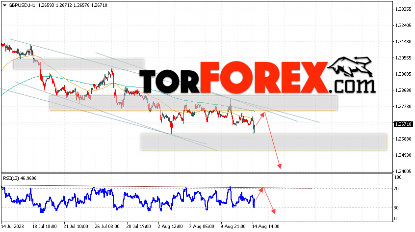 Валютная пара Фунт Доллар GBP/USD продолжает движение в рамках развития падения и медвежьего канала. В момент публикации прогноза курс Фунта к Доллару США на Форекс составляет 1.2671. Скользящие средние указывают на наличие краткосрочной медвежьей тенденции. Цены пробили область между сигнальными линиями вниз, что указывает на давление со стороны продавцов валютной пары и потенциальное продолжение падения инструмента. На данный момент стоит ожидать попытку развития бычьей коррекции курса Британского Фунта против Американского Доллара и тест области сопротивления вблизи уровня 1.2715. Откуда вновь стоит ожидать отскок котировок пары вниз и продолжения падения валютной пары Британского Фунта против Доллара США. Целью снижения пары, в рамках Форекс прогноза на 15 августа 2023, выступает область на уровне 1.2395.