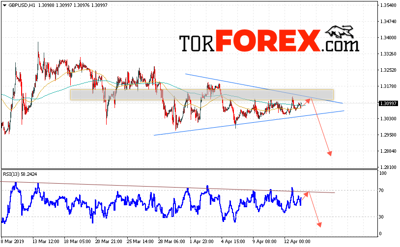 Валютная пара Фунт Доллар GBP/USD продолжает движение в рамках формирования модели «Треугольник». В момент публикации прогноза курс Фунта к Доллару США составляет 1.3099. На данный момент стоит ожидать попытку роста и тест области сопротивления вблизи уровня 1.3110. Откуда вновь стоит ожидать отскок и продолжение падения Фунта против Доллара. Целью нисходящего движения валютной пары, в рамках Форекс прогноза на 16 апреля 2019 года, выступает область на уровне 1.2865.