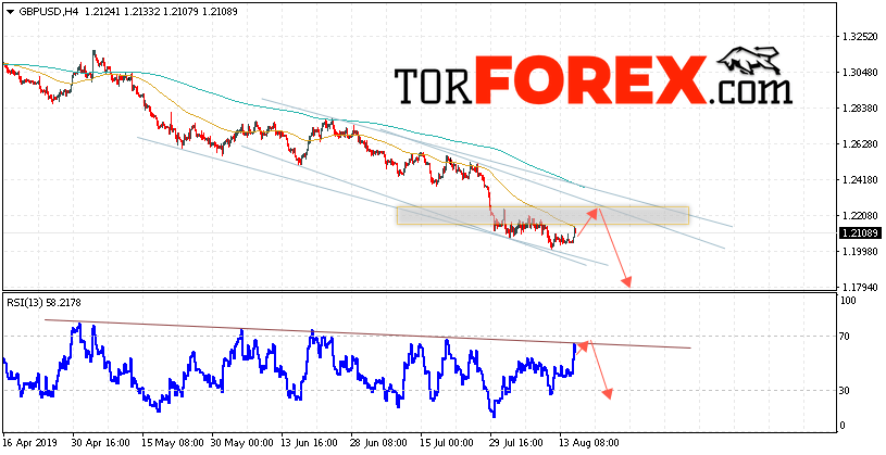 Валютная пара Фунт Доллар GBP/USD продолжает движение в рамках восходящей коррекции и нисходящего канала. В момент публикации прогноза курс Фунта к Доллару США на Форекс составляет 1.2108. Скользящие средние указывают на наличие краткосрочной медвежьей тенденции. На данный момент стоит ожидать попытку роста курса и тест области сопротивления вблизи уровня 1.2205. Откуда вновь стоит ожидать отскок и продолжение падения Британского Фунта против Доллара США. Целью нисходящего движения валютной пары, в рамках Форекс прогноза на 16 августа 2019 года, выступает область на уровне 1.1795.
