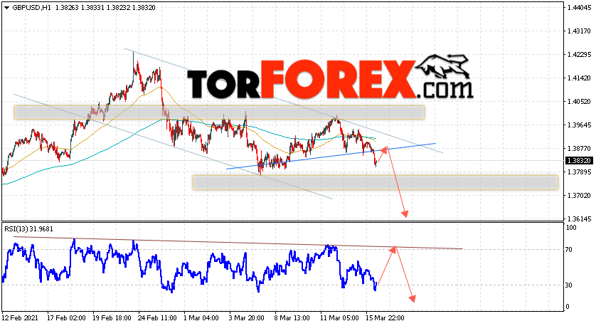 Валютная пара Фунт Доллар GBP/USD продолжает движение в рамках коррекции и нисходящего канала. В момент публикации прогноза курс Фунта к Доллару США на Форекс составляет 1.3832. Скользящие средние указывают на наличие краткосрочной медвежьей тенденции. Цены тестируют область между сигнальными линиями, что указывает на давление со стороны продавцов валютной пары и потенциальное продолжение падения инструмента. На данный момент стоит ожидать попытку бычьей коррекции курса Британского Фунта против Американского Доллара и тест области сопротивления вблизи уровня 1.3875. Откуда вновь стоит ожидать отскок и продолжения падения котировок валютной пары Британского Фунта против Доллара США. Целью нисходящего движения валютной пары, в рамках Форекс прогноза на 17 марта 2021, выступает область на уровне 1.3615.