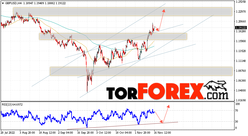 Валютная пара Фунт Доллар GBP/USD продолжает движение в рамках развития коррекции и бычьего канала. В момент публикации прогноза курс Фунта к Доллару США на Форекс составляет 1.1912. Скользящие средние указывают на наличие краткосрочной бычьей тенденции. Цены пробили область между сигнальными линиями вверх, что указывает на давление со стороны покупателей валютной пары и потенциальное продолжение роста инструмента. На данный момент стоит ожидать попытку развития коррекции цены курса Британского Фунта против Американского Доллара и тест области поддержки вблизи уровня 1.1825. Откуда вновь стоит ожидать отскок вверх и продолжения роста котировок валютной пары Британского Фунта против Доллара США. Целью подъёма пары, в рамках Форекс прогноза на 17 ноября 2022, выступает область на уровне 1.2285.