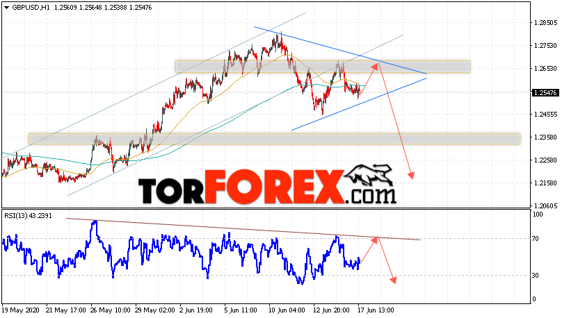 Валютная пара Фунт Доллар GBP/USD продолжает движение в рамках коррекции и формирования модели «Треугольник». В момент публикации прогноза курс Фунта к Доллару США на Форекс составляет 1.2547. Скользящие средние указывают на наличие краткосрочной бычьей тенденции. Цены пробили область между сигнальными линиями вниз, что указывает на давление со стороны продавцов валютной пары. На данный момент стоит ожидать попытку развития роста курса Британского Фунта против Американского Доллара и тест области сопротивления вблизи уровня 1.2655. Откуда вновь стоит ожидать отскок и продолжения падения котировок валютной пары Британского Фунта против Доллара США. Целью нисходящего движения валютной пары, в рамках Форекс прогноза на 18 июня 2020 года, выступает область на уровне 1.2165.