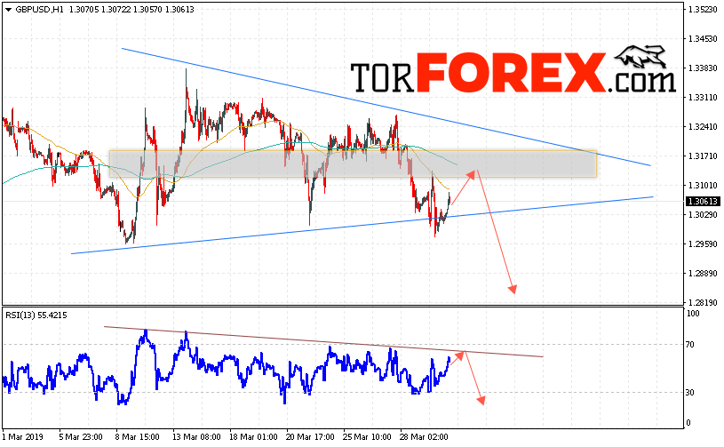 Валютная пара Фунт Доллар GBP/USD продолжает движение в рамках коррекции и формирования разворотной модели. В момент публикации прогноза курс Фунта к Доллару США составляет 1.3061. На данный момент стоит ожидать попытку роста и тест области сопротивления вблизи уровня 1.3115. Откуда вновь стоит ожидать отскок и продолжение падения Фунта против Доллара. Целью нисходящего движения валютной пары, в рамках Форекс прогноза на 2 апреля 2019 года, выступает область на уровне 1.2815.