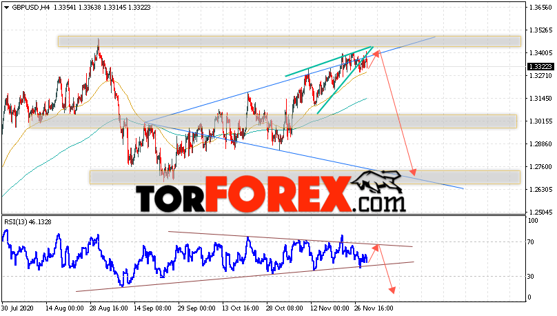 Валютная пара Фунт Доллар GBP/USD продолжает движение в рамках роста и формирования медвежьей модели ”Волна Вульфа”. В момент публикации прогноза курс Фунта к Доллару США на Форекс составляет 1.3322. Скользящие средние указывают на наличие краткосрочной бычьей тенденции. Цены оттолкнулись от области между сигнальными линиями вверх, что указывает на давление со стороны покупателей валютной пары и потенциальное продолжение роста инструмента. На данный момент стоит ожидать попытку бычьей коррекции курса Британского Фунта против Американского Доллара и тест области сопротивления вблизи уровня 1.3405. Откуда вновь стоит ожидать отскок и продолжение падения котировок валютной пары Британского Фунта против Доллара США. Целью нисходящего движения валютной пары, в рамках Форекс прогноза на 2 декабря 2020, выступает область на уровне 1.3015.