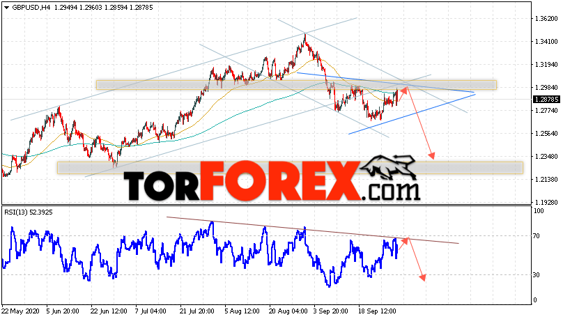 Валютная пара Фунт Доллар GBP/USD продолжает движение в рамках коррекции и формирования модели ”Треугольник”. В момент публикации прогноза курс Фунта к Доллару США на Форекс составляет 1.2878. Скользящие средние указывают на наличие краткосрочной медвежьей тенденции. Цены тестируют область между сигнальными линиями, что указывает на давление со стороны продавцов валютной пары и потенциальное продолжение падения актива. На данный момент стоит ожидать попытку коррекции курса Британского Фунта против Американского Доллара и тест области сопротивления вблизи уровня 1.2975. Откуда вновь стоит ожидать отскок и начало падения котировок валютной пары Британского Фунта против Доллара США. Целью нисходящего движения валютной пары, в рамках Форекс прогноза на 2 октября 2020, выступает область на уровне 1.2355.