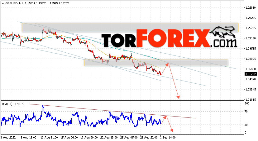 Валютная пара Фунт Доллар GBP/USD продолжает движение в рамках падения и нисходящего канала. В момент публикации прогноза курс Фунта к Доллару США на Форекс составляет 1.1570. Скользящие средние указывают на наличие краткосрочной медвежьей тенденции. Цены пробили область между сигнальными линиями вниз, что указывает на давление со стороны продавцов валютной пары и потенциальное продолжение падения инструмента. На данный момент стоит ожидать попытку развития бычьей коррекции цены курса Британского Фунта против Американского Доллара и тест области сопротивления вблизи уровня 1.1675. Откуда вновь стоит ожидать отскок вниз и продолжения падения котировок валютной пары Британского Фунта против Доллара США. Целью снижения пары, в рамках Форекс прогноза на 2 сентября 2022, выступает область на уровне 1.1195.