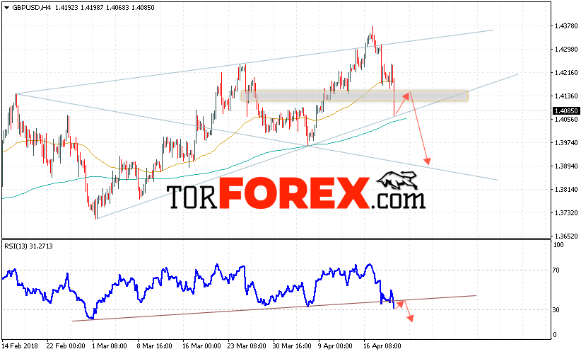 Таким образом, GBP/USD прогноз Фунт Доллар на 20 апреля 2018 предполагает попытку теста области сопротивления вблизи уровня 1.4140 и продолжение падения с целью ниже уровня 1.3900, дополнительным сигналом в пользу падения Британского Фунта выступит тест линии тренда на индикаторе относительной силы, отменой варианта снижения станет сильный рост и пробой области 1.4140.