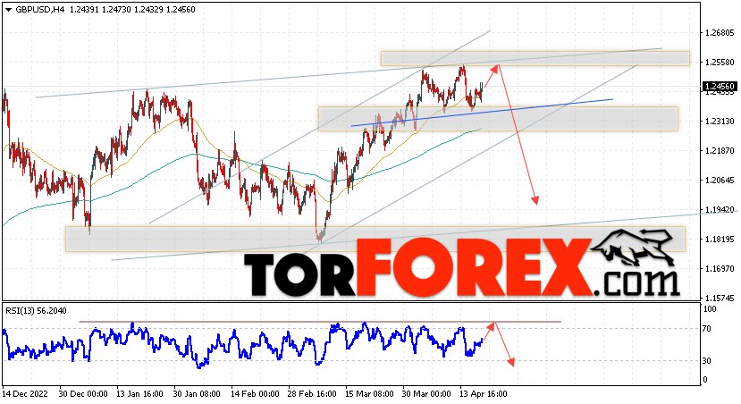 Валютная пара Фунт Доллар GBP/USD продолжает движение в рамках развития роста и формирования разворотной модели ”Голова и плечи”. В момент публикации прогноза курс Фунта к Доллару США на Форекс составляет 1.2456. Скользящие средние указывают на наличие краткосрочной бычьей тенденции. Цены пробили область между сигнальными линиями вверх, что указывает на давление со стороны покупателей валютной пары и потенциальное продолжение роста инструмента. На данный момент стоит ожидать попытку развития подъёма курса Британского Фунта против Американского Доллара и тест области сопротивления вблизи уровня 1.2535. Откуда вновь стоит ожидать отскок вниз и продолжения падения котировок валютной пары Британского Фунта против Доллара США. Целью снижения пары, в рамках Форекс прогноза на 20 апреля 2023, выступает область на уровне 1.1955.