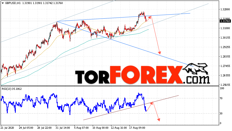 Таким образом, GBP/USD прогноз Фунт Доллар на 20 августа 2020 предполагает попытку теста области сопротивления вблизи уровня 1.3195. Затем, продолжение падения с целью ниже уровня 1.2845. Дополнительным сигналом в пользу снижения Британского Фунта выступит тест линии сопротивления на индикаторе относительной силы. Отменой варианта падения станет сильный рост цены и пробой области 1.3305. Это укажет на продолжение подъёма пары с потенциальной целью выше уровня 1.3545.