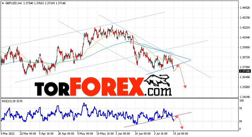 Валютная пара Фунт Доллар GBP/USD продолжает движение в рамках падения и начала отработки модели ”Треугольник”. В момент публикации прогноза курс Фунта к Доллару США на Форекс составляет 1.3714. Скользящие средние указывают на наличие краткосрочной медвежьей тенденции. Цены пробили вниз область между сигнальными линиями, что указывает на давление со стороны продавцов валютной пары и потенциальное продолжение падения инструмента. На данный момент стоит ожидать попытку бычьей коррекции курса Британского Фунта против Американского Доллара и тест области сопротивления вблизи уровня 1.3775. Откуда вновь стоит ожидать отскок и продолжения падения котировок валютной пары Британского Фунта против Доллара США. Целью нисходящего движения пары, в рамках Форекс прогноза на 20 июля 2021, выступает область на уровне 1.3525.