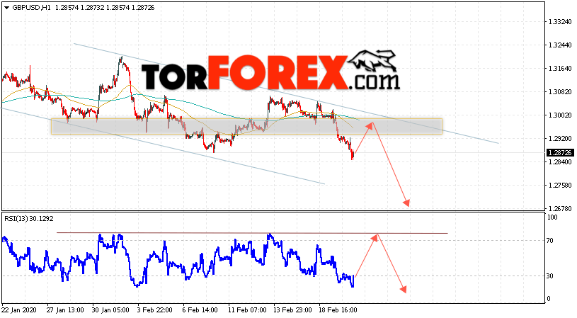 Валютная пара Фунт Доллар GBP/USD продолжает движение в рамках снижения и нисходящего канала. В момент публикации прогноза курс Фунта к Доллару США на Форекс составляет 1.2872. Скользящие средние указывают на наличие краткосрочной медвежьей тенденции. Цены оттолкнулись от области между линиями, что указывает на давление со стороны продавцов. На данный момент стоит ожидать попытку роста курса Британского Фунта и тест области сопротивления вблизи уровня 1.2945. Откуда вновь стоит ожидать отскок и продолжения падения котировок валютной пары Британского Фунта против Доллара США. Целью нисходящего движения валютной пары, в рамках Форекс прогноза на 21 февраля 2020 года, выступает область на уровне 1.2675.