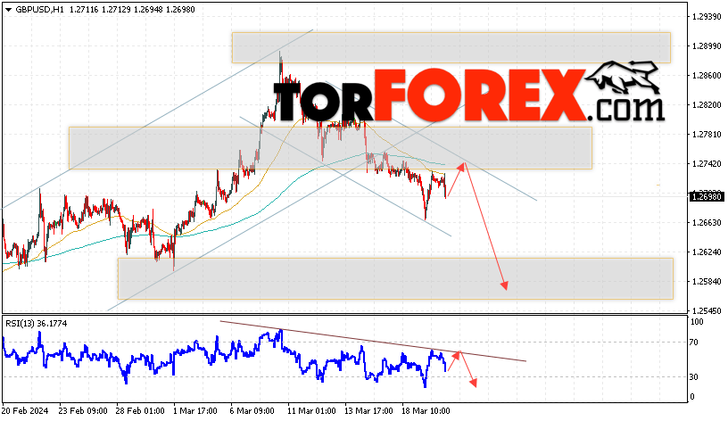 Таким образом, GBP/USD прогноз Фунт Доллар на 21 марта 2024 предполагает попытку теста области сопротивления вблизи уровня 1.2745. Затем, продолжение снижения с целью вблизи уровня 1.2575. Дополнительным сигналом в пользу падения Британского Фунта выступит тест линии сопротивления на индикаторе относительной силы (RSI). Отменой варианта снижения станет сильный рост Британского Фунта против Доллара США и пробой области 1.2835. Это укажет на продолжение подъёма на Форекс пары с потенциальной целью выше уровня 1.2985.