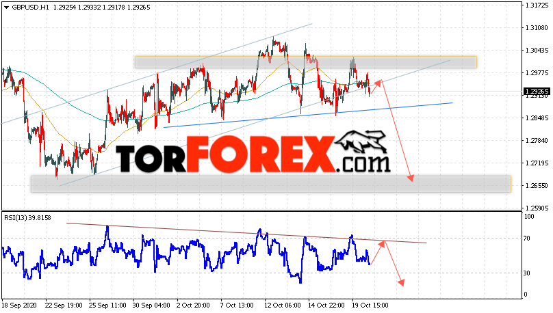 Валютная пара Фунт Доллар GBP/USD продолжает движение в рамках бычьей коррекции и формирования разворотной модели ”Голова и плечи”. В момент публикации прогноза курс Фунта к Доллару США на Форекс составляет 1.2926. Скользящие средние указывают на наличие краткосрочной боковой тенденции. Цены пробили область между сигнальными линиями вниз, что указывает на давление со стороны продавьцов валютной пары и потенциальное продолжение падение актива. На данный момент стоит ожидать попытку бычьей коррекции курса Британского Фунта против Американского Доллара и тест области сопротивления вблизи уровня 1.2965. Откуда вновь стоит ожидать отскок и начало падения котировок валютной пары Британского Фунта против Доллара США. Целью нисходящего движения валютной пары, в рамках Форекс прогноза на 21 октября 2020, выступает область на уровне 1.2665.