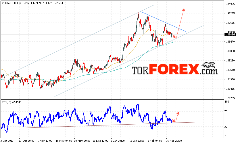 Таким образом, GBP/USD прогноз Фунт Доллар на 22 февраля 2018 предполагает попытку теста нижней границы канала вблизи области 1.3950 и продолжение роста с целью выше уровня 1.4450, дополнительным сигналом в пользу роста Британского Фунта выступит тест линии тренда на индикаторе относительной силы.