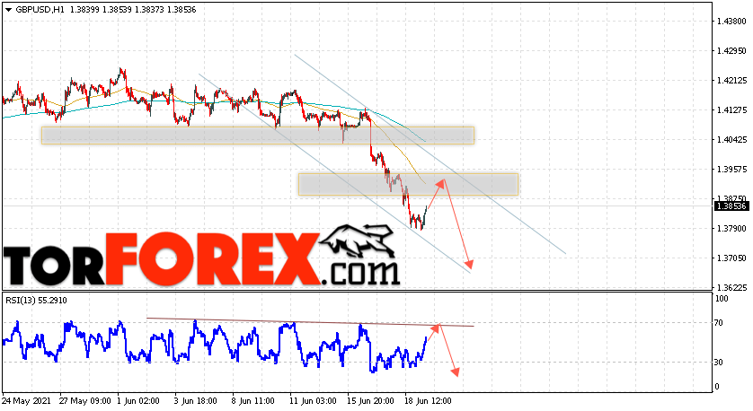Валютная пара Фунт Доллар GBP/USD продолжает движение в рамках падения и покинули пределы бычьего канала. В момент публикации прогноза курс Фунта к Доллару США на Форекс составляет 1.3853. Скользящие средние указывают на наличие краткосрочной бычьей тенденции. Цены пробили область между сигнальными линиями вниз, что указывает на давление со стороны продавцов валютной пары и потенциальное продолжение падения инструмента. На данный момент стоит ожидать попытку роста курса Британского Фунта против Американского Доллара и тест области сопротивления вблизи уровня 1.3925. Откуда вновь стоит ожидать отскок и продолжения падения котировок валютной пары Британского Фунта против Доллара США. Целью нисходящего движения пары, в рамках Форекс прогноза на 22 июня 2021, выступает область на уровне 1.3675.