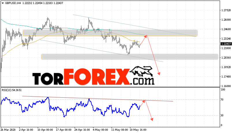 Валютная пара Фунт Доллар GBP/USD продолжает движение в рамках сильной восходящей коррекции и нисходящего канала. В момент публикации прогноза курс Фунта к Доллару США на Форекс составляет 1.2243. Скользящие средние указывают на наличие краткосрочной медвежьей тенденции. Цены тестируют область между сигнальными линиями, что указывает на давление со стороны продавцов валютной пары и потенциальное продолжение падения котировок уже с текущих уровней. На данный момент стоит ожидать попытку развития коррекции курса Британского Фунта против Американского Доллара и тест области сопротивления вблизи уровня 1.2345. Откуда вновь стоит ожидать отскок и продолжения падения котировок валютной пары Британского Фунта против Доллара США. Целью нисходящего движения валютной пары, в рамках Форекс прогноза на 22 мая 2020 года, выступает область на уровне 1.1745.