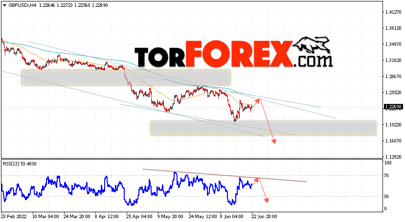 Валютная пара Фунт Доллар GBP/USD продолжает движение в рамках развития бычьей коррекции и нисходящего канала. В момент публикации прогноза курс Фунта к Доллару США на Форекс составляет 1.2276. Скользящие средние указывают на наличие краткосрочной медвежьей тенденции. Цены вновь тестируют область между сигнальными линиями, что указывает на давление со стороны продавцов валютной пары и потенциальное продолжение падения инструмента. На данный момент стоит ожидать попытку развития подъёма цены курса Британского Фунта против Американского Доллара и тест области сопротивления вблизи уровня 1.2315. Откуда вновь стоит ожидать отскок вниз и продолжения падения котировок валютной пары Британского Фунта против Доллара США. Целью снижения пары, в рамках Форекс прогноза на 23 июня 2022, выступает область на уровне 1.1605.