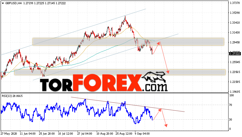 Валютная пара Фунт Доллар GBP/USD продолжает движение в рамках падения и смогла покинуть пределы восходящего канала. В момент публикации прогноза курс Фунта к Доллару США на Форекс составляет 1.2722. Скользящие средние указывают на наличие краткосрочной медвежьей тенденции. Цены пробили область между сигнальными линиями вниз, что указывает на давление со стороны продавцов валютной пары и потенциальное продолжение падения актива. На данный момент стоит ожидать попытку коррекции курса Британского Фунта против Американского Доллара и тест области сопротивления вблизи уровня 1.2935. Откуда вновь стоит ожидать отскок и начало падения котировок валютной пары Британского Фунта против Доллара США. Целью нисходящего движения валютной пары, в рамках Форекс прогноза на 23 сентября 2020, выступает область на уровне 1.2355.