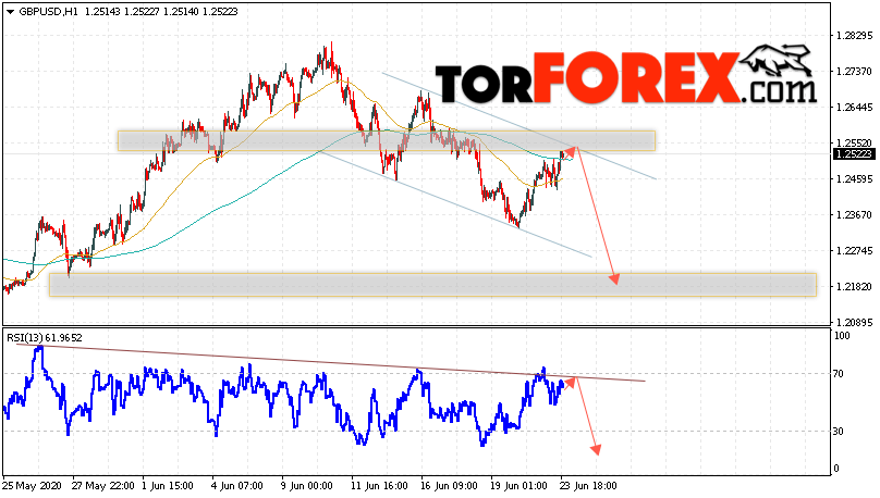 Валютная пара Фунт Доллар GBP/USD продолжает движение в рамках коррекции и нисходящего канала. В момент публикации прогноза курс Фунта к Доллару США на Форекс составляет 1.2522. Скользящие средние указывают на наличие краткосрочной медвежьей тенденции. Цены пробили область между сигнальными линиями вверх, что указывает на давление со стороны покупателей валютной пары. На данный момент стоит ожидать попытку развития роста курса Британского Фунта против Американского Доллара и тест области сопротивления вблизи уровня 1.2545. Откуда вновь стоит ожидать отскок и продолжения падения котировок валютной пары Британского Фунта против Доллара США. Целью нисходящего движения валютной пары, в рамках Форекс прогноза на 24 июня 2020 года, выступает область на уровне 1.2185.