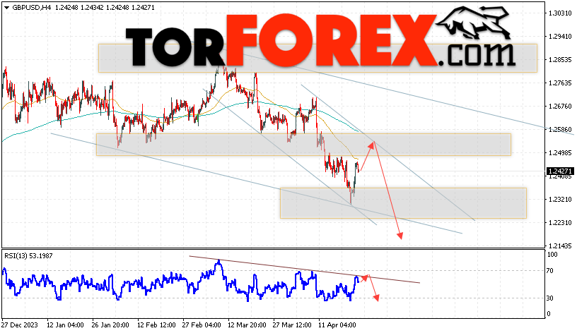Валютная пара Фунт Доллар GBP/USD продолжает движение в рамках развития падения и медвежьего канала. В момент публикации прогноза курс Фунта к Доллару США на Форекс составляет 1.2427. Скользящие средние указывают на наличие краткосрочной медвежьей тенденции. Цены пробили область между сигнальными линиями вниз, что указывает на давление со стороны продавцов валютной пары и потенциальное продолжение падения инструмента. На данный момент стоит ожидать попытку развития подъёма курса Британского Фунта против Американского Доллара и тест области сопротивления вблизи уровня 1.2505. Откуда вновь стоит ожидать отскок котировок пары вниз и продолжения падения валютной пары Британского Фунта против Доллара США. Целью снижения пары, в рамках Форекс прогноза, выступает область на уровне 1.2155.