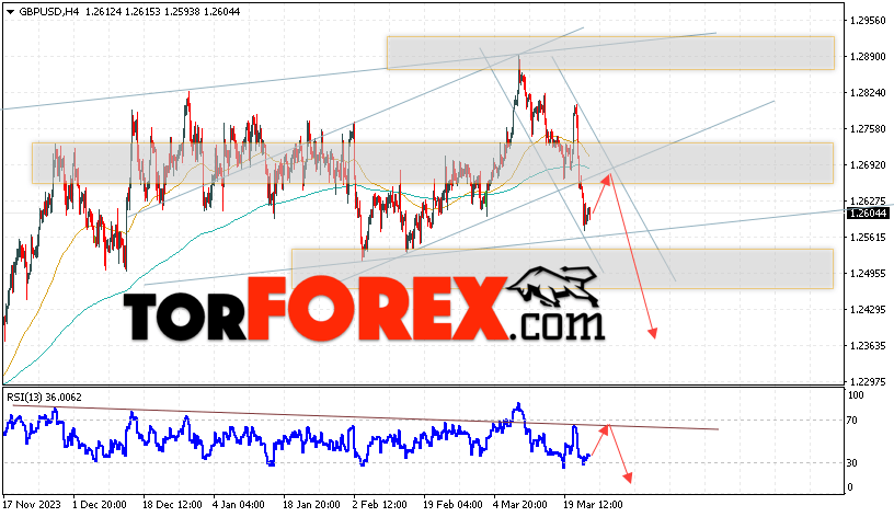 Таким образом, GBP/USD прогноз Фунт Доллар на 26 марта 2024 предполагает попытку теста области сопротивления вблизи уровня 1.2645. Затем, продолжение снижения с целью вблизи уровня 1.2365. Дополнительным сигналом в пользу падения Британского Фунта выступит тест линии сопротивления на индикаторе относительной силы (RSI). Отменой варианта снижения станет сильный рост Британского Фунта против Доллара США и пробой области 1.2805. Это укажет на продолжение подъёма на Форекс пары с потенциальной целью выше уровня 1.3075.