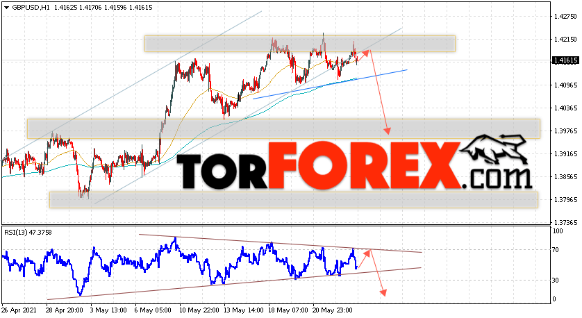 Таким образом, GBP/USD прогноз Фунт Доллар на 26 мая 2021 предполагает попытку теста области сопротивления вблизи уровня 1.4180. Затем, продолжение падения с целью ниже уровня 1.3965. Дополнительным сигналом в пользу падения Британского Фунта выступит тест линии сопротивления на индикаторе относительной силы. Отменой варианта падания станет сильный рост и пробой области 1.4255. Это укажет на продолжение подъёма пары с потенциальной целью выше уровня 1.4565.