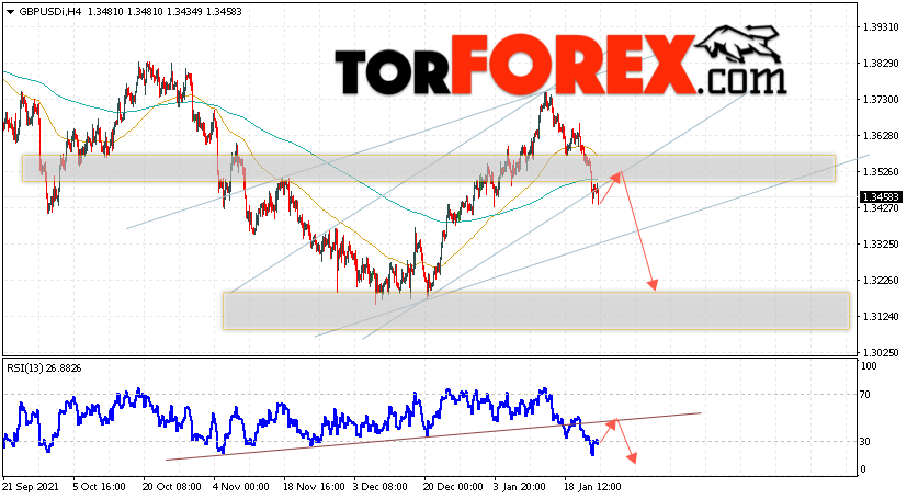 Валютная пара Фунт Доллар GBP/USD продолжает движение в рамках падения и нисходящего канала. В момент публикации прогноза курс Фунта к Доллару США на Форекс составляет 1.3458. Скользящие средние указывают на наличие краткосрочной бычьей тенденции. Цены пробили область между сигнальными линиями вниз, что указывает на давление со стороны продавцов валютной пары и потенциальное продолжение падения инструмента. На данный момент стоит ожидать попытку коррекции цены курса Британского Фунта против Американского Доллара и тест области сопротивления вблизи уровня 1.3495. Откуда вновь стоит ожидать отскок вниз и продолжения падения котировок валютной пары Британского Фунта против Доллара США. Целью снижения пары, в рамках Форекс прогноза на 26 января 2022, выступает область на уровне 1.3225.
