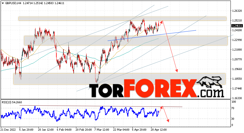 Таким образом, GBP/USD прогноз Фунт Доллар на 27 апреля 2023 предполагает попытку теста области сопротивления вблизи уровня 1.2485. Затем, продолжение падения с целью вблизи уровня 1.1945. Дополнительным сигналом в пользу снижения Британского Фунта выступит тест линии сопротивления на индикаторе относительной силы (RSI). Отменой варианта падения станет сильный рост Фунта против Доллара США и пробой области 1.2655. Это укажет на продолжение подъёма на Форекс пары с потенциальной целью выше уровня 1.2765.