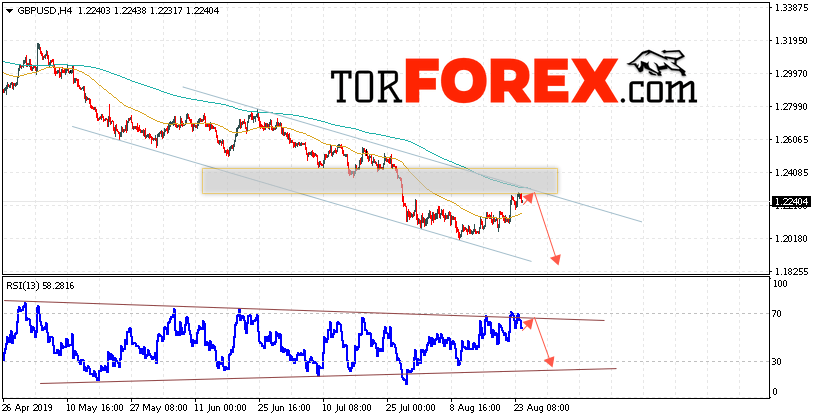 Валютная пара Фунт Доллар GBP/USD продолжает движение в рамках коррекции и нисходящего канала. В момент публикации прогноза курс Фунта к Доллару США на Форекс составляет 1.2240. Скользящие средние указывают на наличие краткосрочной медвежьей тенденции. На данный момент стоит ожидать попытку роста курса и тест области сопротивления вблизи уровня 1.2265. Откуда вновь стоит ожидать отскок и продолжение падения Британского Фунта против Доллара США. Целью нисходящего движения валютной пары, в рамках Форекс прогноза на 27 августа 2019 года, выступает область на уровне 1.1835.