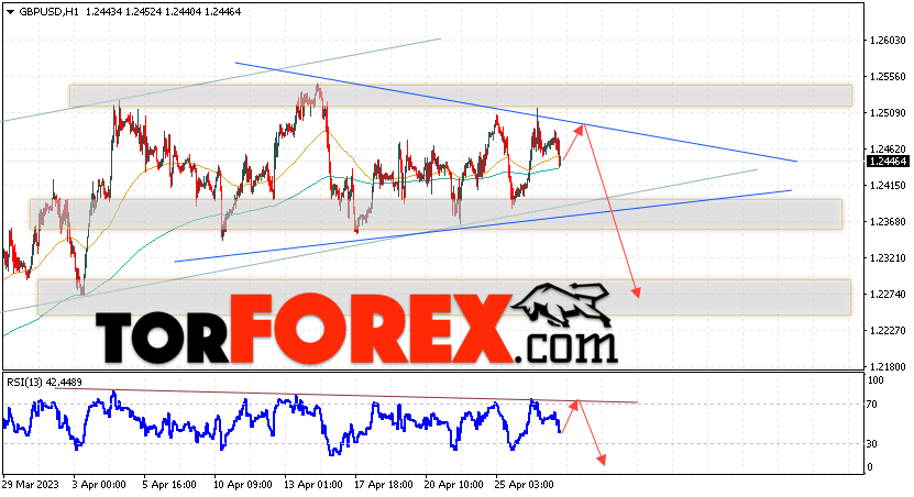 Таким образом, GBP/USD прогноз Фунт Доллар на 28 апреля 2023 предполагает попытку теста области сопротивления вблизи уровня 1.2465. Затем, продолжение падения с целью вблизи уровня 1.2275. Дополнительным сигналом в пользу снижения Британского Фунта выступит тест линии сопротивления на индикаторе относительной силы (RSI). Отменой варианта падения станет сильный рост Фунта против Доллара США и пробой области 1.2585. Это укажет на продолжение подъёма на Форекс пары с потенциальной целью выше уровня 1.2735.